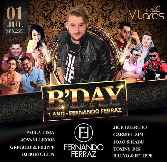 O primeiro ano da carreira solo de Fernando Ferraz será comemorado no Villaras nesta sexta-feira, dia 1. Além do anfitrião, o casarão do bairro Liri terá Paula Lima, Jovani Lemos, Gregory & Filippe, DJ Bortollin, Jr. Figueredo, Gabriel Zim, João & Kadu, Toxiny DJs e Bruno & Felippe. Os ingressos serão vendidos no local por R$ 10 às mulheres e R$ 20 aos homens com nome na lista até 1h. Para se inscrever basta entrar em contato pelo telefone (48) 9841-7309.