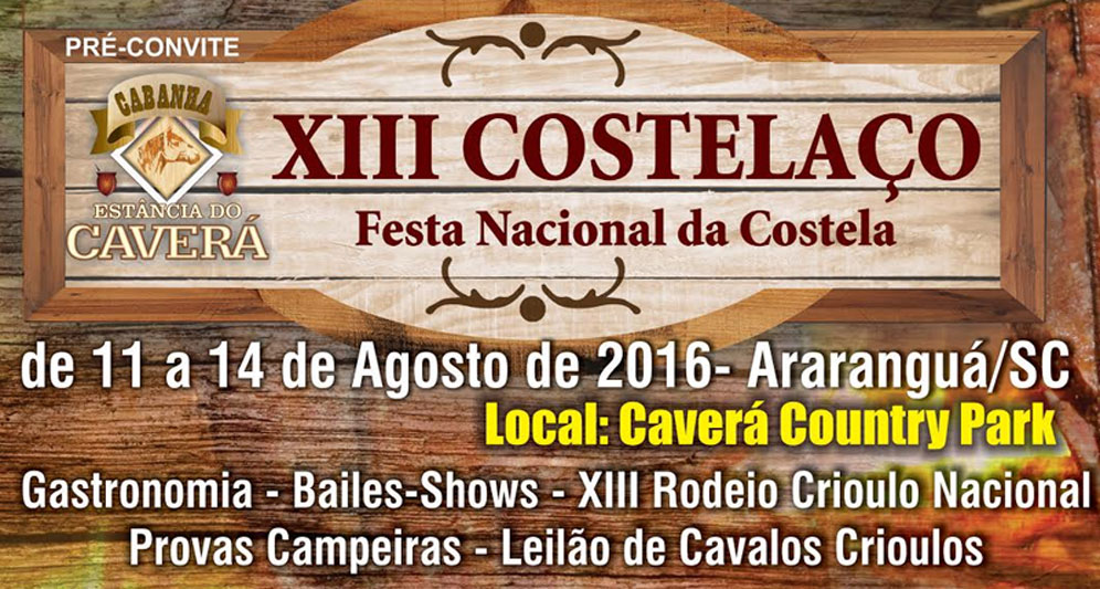 A Cabanha Estância do Caverá está em contagem regressiva para a 13ª edição da Festa Nacional da Costela. A programação oficial inicia com a tradicional cavalgada nas principais ruas de Araranguá nesta quinta-feira, dia 11. Além disso, terá um baile - com entrada gratuita para as mulheres - animado pelo Grupo Bem Gaúcho. Na sexta-feira o fandango ficará por conta do Grupo Bailaço e no sábado será com o Grupo Tchê Barbaridade.