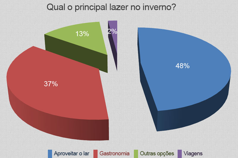 Em dias de frio, a melhor opção é curtir o lar. Ao menos esta é a preferência de 48% dos internautas do Canal Içara. A gastronomia aparece como segunda melhor alternativa para tornar os dias e noites mais agradáveis. As viagens figuram com 2% enquanto outras opções somam 13%. A enquete realizada pelo portal Canal Içara ocorreu entre os dias 20 e 27 de junho. Ao todo, participaram espontaneamente 46 leitores.