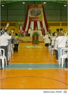 A Celebração de Pentecostes foi reproduzida no Complexo Esportivo João Ramos Roussenq neste domingo, dia 28. A comemoração católica fez do ginásio um templo. Além de canções e rezas, teve teatro. Tudo isso para relembrar o Espírito Santo que tocou os apóstolos em Jerusalém. O evento da Paróquia São Donato ocorreu com a participação de dezenas de fieis e o bispo Dom Jacinto Inácio Flach.
