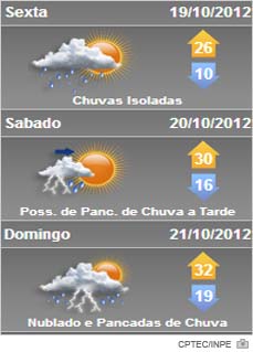 No sábado predominará a nebulosidade variável em Santa Catarina com condições de pancadas de chuva e trovoadas pela manhã no Oeste e nas demais regiões entre a tarde e a noite. Isto devido a um cavado (área alongada de baixa pressão). Temperatura elevada com sensação de ar abafado. Nestes próximos dias as temperaturas variarão dos 8ºC a 28ºC.