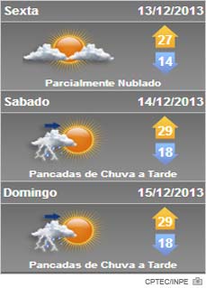 No sábado e domingo, o Sol ficará entre nuvens e as condições proporcionarão ainda pancadas isoladas de chuva entre a tarde e noite, também típicas de verão. Temperatura em elevação, mais alta no fim de semana. O Ciram também indica tempo mais seco com presença de Sol, algumas nuvens e temperaturas mais altas na segunda-feira com até 30ºC.