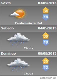 No domingo chuva isolada na madrugada. No decorrer do dia, o tempo melhora com Sol e poucas nuvens devido ao avanço de uma massa de ar frio e seco de forte intensidade, com declínio acentuado de temperatura. Vento de sudoeste a sul, moderado com rajadas de 60 a 80km/h.