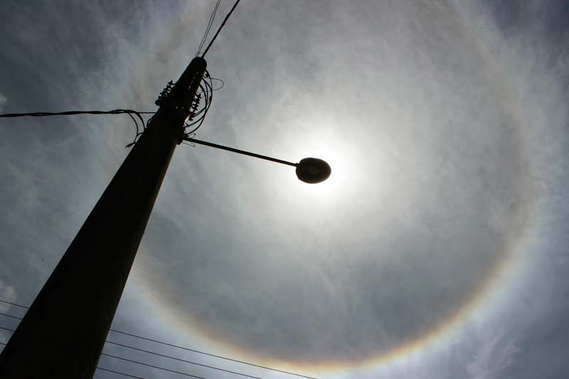 Um arco-íris no entorno do Sol foi registrado pelo fotógrafo Bruno Neka Dal Ponte ao meio-dia desta segunda-feira, dia 20. O fenômeno óptico é uma consequência da reflexão da luz nos cristais de gelo da atmosfera a cerca de 17 quilômetros de altitude. Por vezes, ocorre também com a Lua. Segundo meteorologistas, o registro costuma anteceder a chegada de uma frente fria.