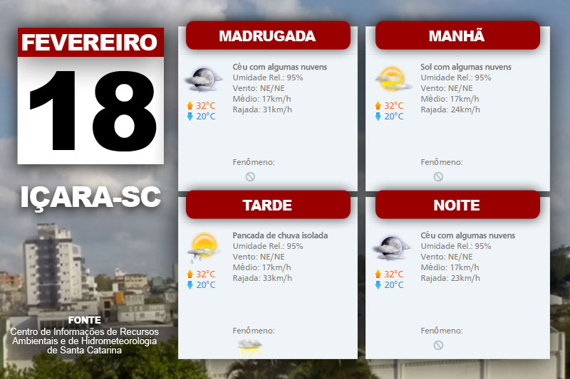 Núcleos de instabilidade se formam com chuvas e trovoadas a tarde devido ao calor e ao avanço de uma frente fria pelo oceano. O Centro de Informações de Recursos Ambientais e de Hidrometeorologia de Santa Catarina indica ainda temperatura elevada. No Oeste e Norte do estado chegará próximo a 36°C.
