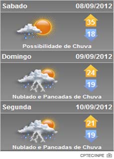 Neste sábado o Sol aparece com aumento de nuvens em todas as regiões e condições de chuva isolada à noite nas áreas que fazem divisa com o Rio Grande do Sul. Isto devido a aproximação de uma frente fria. Temperatura elevada para época do ano.