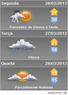Na segunda-feira o Sol aparece entre nuvens em boa parte do estado. Mas persistem os períodos nublados com chuva no Litoral e áreas próximas tanto no início do dia pela influência da circulação marítima quanto à noite devido à aproximação de uma frente fria. Temperatura em elevação durante a tarde.
