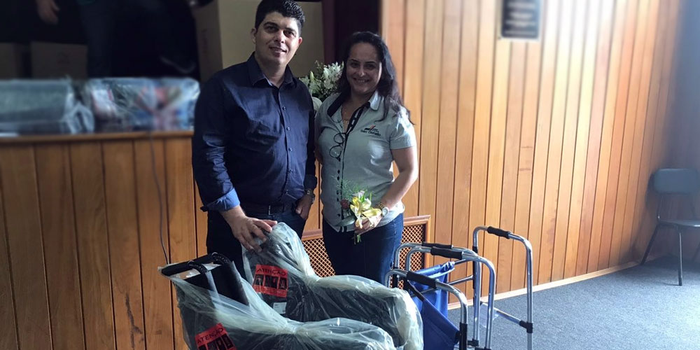 Duas novas cadeiras de rodas e duas cadeiras de banho vão contribuir na melhoria da rotina de atendimento no Hospital São Donato a partir desta quarta-feira, dia 26. São equipamentos de uso frequente, por isso, têm desgaste acelerado e precisam ser constantemente renovados. A entrega ao vice-presidente Rodrigo Gonçalves e a coordenadora de Patrimônio Karla Vicente foi realizada pela Fundação Nova Vida ao Hospital São Donato em cerimônia em Nova Veneza.