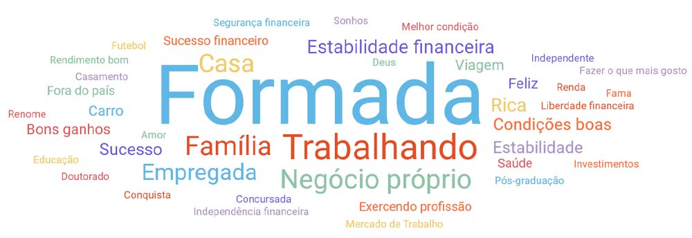 Apesar de jovens, muitos dos estudantes já têm o futuro traçado. A maioria se vê formado(a) para o exercício de uma profissão. Mas os sonhos vão além. O empreendedorismo, a família, a casa própria e a estabilidade financeira são algumas das palavras mais comuns nas respostas dos alunos de ensino médio.