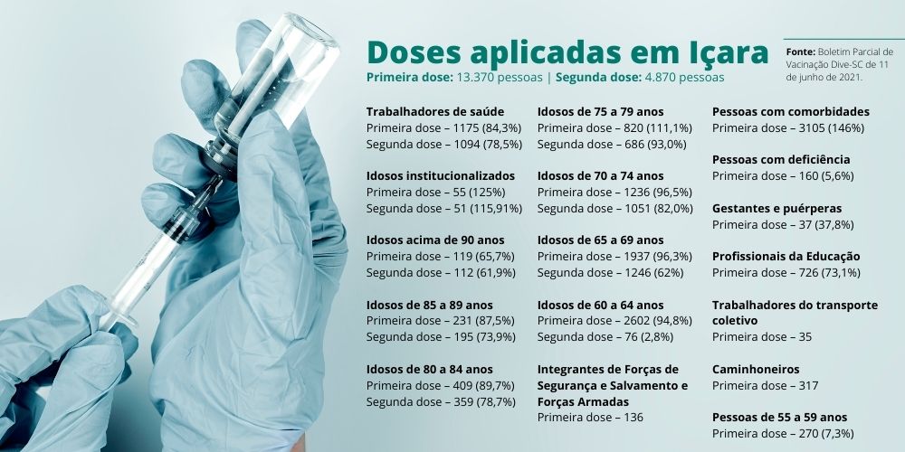 Todas as doses devem ser aplicadas a pessoas com idades entre 50 e 59 anos, o próximo grupo a ser contemplado pela campanha de vacinação contra o coronavírus – de acordo com dados da Vigilância Epidemiológica de Santa Catarina (Dive/SC), em Içara são 3.867 pessoas nessa faixa etária. O calendário elaborado pela Secretaria de Estado da Saúde aponta que a imunização desse público iniciará na segunda-feira, 14, com previsão de se estender até 30 de junho.