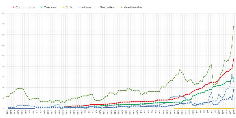 Içara teve 46 casos de covid-19 confirmados nesta terça-feira, 21 de julho. O número deste único dia é equivalente a somatória dos casos registrados ao longo dos sete dias anteriores. O boletim epidemiológico mais atual do Município indica que a cidade atingiu 235 casos confirmados, dos quais, 145 estão curados. Entre os 90 içarenses com a covid-19 ativa, 78 estão em tratamento domiciliar, oito em tratamento hospitalar e quatro em terapia intensiva. A cidade soma ainda 127 casos suspeitos e 390 monitorados, além de um óbito.