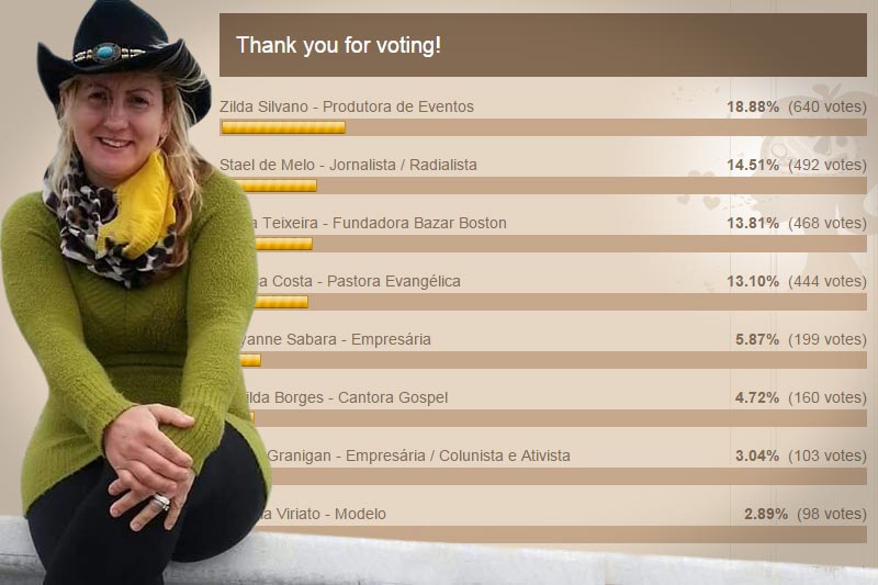 Para contribuir com a içarense é necessário o voto pelo site da Brazilian Community Heritage Fondation [notavelusa.com]. O nome dela consta ao final de uma lista de 28 mulheres. “As pessoas podem votar uma vez por semana até a segunda semana de março”, explica, atualmente, em primeiro lugar. Até agora recebeu 640 votos. Isto significa 18,88%. A expectativa é que a liderança continue para a premiação. “Será em março, em uma noite de gala com jantar, mas a organização ainda está fechando a data”, completa.