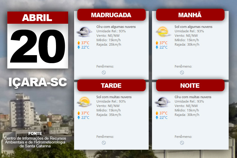 A previsão não muda diante do calor dos últimos dias. Isto significa que o predomínio de Sol e calor domina no estado ainda nesta quarta-feira, dia 20. O Centro de Informações de Recursos Ambientais e de Hidrometeorologia de Santa Catarina indica temperatura alta com máxima acima de 30°C em todas as regiões. Além disso, o Ciram aponta vento nordeste a noroeste, fraco a moderado.