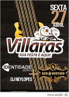 O Villaras voltará a causar congestionamento da margem da SC-444 nesta sexta-feira, dia 27. Desta vez o motivo será a combinação de Identidade Zero, Rud & Gustavo, além do DJ Ney Lopes. Em Içara os ingressos antecipados estão à venda no Posto Nicão. Já em Criciúma podem ser encontrados no Posto Chile da Próspera. Aos homens custam R$ 20 enquanto que para as mulheres valem R$ 10.