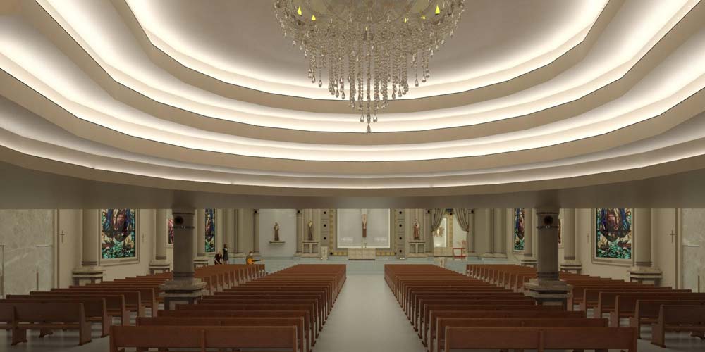 “Nas paredes e no teto vamos utilizar tons que dialoguem com as pedras de travertino existentes nos pilares. Serão instaladas luminárias e lustres com luzes em tom amarelo e ainda teremos a pintura do céu no arco central”, indica Fernanda. O altar, por vez, passará por uma transformação com LED no contorno de Cristo e a padronização das cores de fundo. A pintura e iluminação também vão ser estendidas para a área externa com o propósito de enaltecer também os detalhes da torre central e torna-la visível novamente em diferentes pontos da região central da cidade.