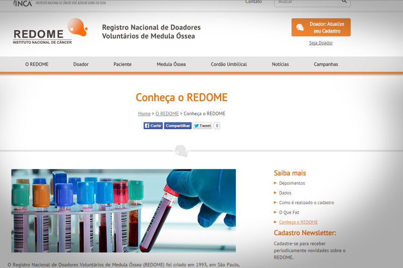 O Instituto Nacional de Câncer José Alencar Gomes da Silva (Inca) lançou um portal dedicado exclusivamente ao registro de doadores voluntários de medula óssea. De acordo com o coordenador Luis Fernando Bouzas, a intenção é tirar dúvidas dos doadores, profissionais e pacientes pelo endereço redome.inca.gov.br. O ponto mais importante é a ferramenta que possibilita ao doador atualizar seu cadastro. O cuidado é importante para que o Redome possa localizar rapidamente a pessoa, quando ela for selecionada para realizar a doação.