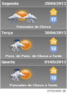 Nesta segunda-feira o tempo fica instável com muitas nuvens e pancadas isoladas de chuva no decorrer do dia deste o Oeste ao Litoral Sul. Nas outras regiões as condições climáticas se repetem entre a tarde e noite devido ao avanço da frente fria. Temperatura elevada, especialmente no Litoral e Norte do Estado.