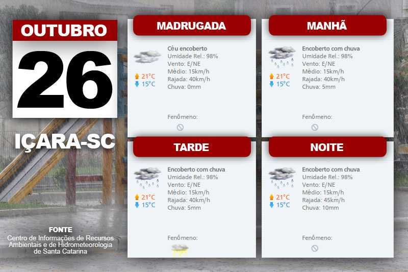 O predomínio de nebulosidade e condições de chuva em todas as regiões ocorre devido a proximidade de um sistema de baixa pressão e a influência de ventos fortes em altitude. O risco de temporal isolado com granizo também retorna nesta segunda-feira. “Temperatura amena. Vento de leste a nordeste, fraco a moderado com rajadas mais intensas no Litoral”, completa a meteorologista do Centro de Informações de Recursos Ambientais e de Hidrometeorologia de Santa Catarina, Gilsânia Cruz.