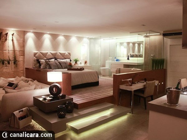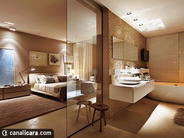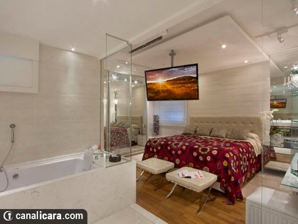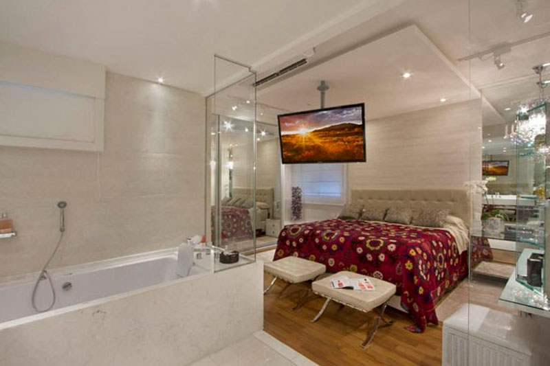 A integração dos ambientes já não é mais uma novidade na arquitetura. É uma tendência nas salas e cozinhas. Mas agora começa a ser incorporada também na área íntima com a eliminação das divisórias entre o quarto e o banheiro. "Isto ocorre principalmente devido aos inevitáveis espaços com dimensões reduzidas e a necessidade de maior interatividade entre as pessoas", coloca a arquiteta Kamila Goulart, do escritório Edifique, em Içara.