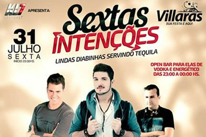 A balada Sextas Intenções encerrará o mês no Villaras neste dia 31. A comemoração no casarão do bairro Liri acontecerá com Benito, Gabriel Zim e Edu Rosa. Além disso, terá open bar para as mulheres com vodka e energético das 23h até às 23h59. O acesso também será gratuito neste horário se elas colocarem o nome antecipadamente pelo telefone 9690-4757. Depois disso, os ingressos femininos serão R$ 10. Já aos homens custarão R$ 20.