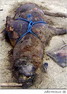 "Conforme contatos com pescadores que visualizaram o animal, o mesmo chegou ainda vivo na praia da Barra Velha próximo a plataforma sul e com as cordas amarradas (devendo ter sido amarradas ainda em alto mar) no dia 2 de novembro", explica a analista ambiental da APA, Luciana Moreira. "Salientamos que a desinfecção deve ser solicitada à Prefeitura e Fundai", pontua ela.