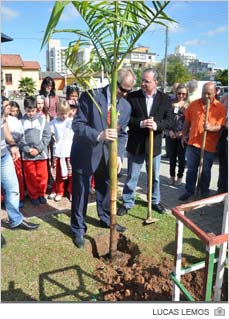 João Vitor Tomé Colle teve uma tarefa especial nesta quarta-feira, dia 21. O garoto de 10 anos foi envolvido diretamente no plantio de uma árvore na Praça do Imigrante. Cada vez que passar pela palmeira colocada junto com colegas da Escola Lúcia De Lucca lembrará certamente então da participação que teve e zelará pelo crescimento da planta.