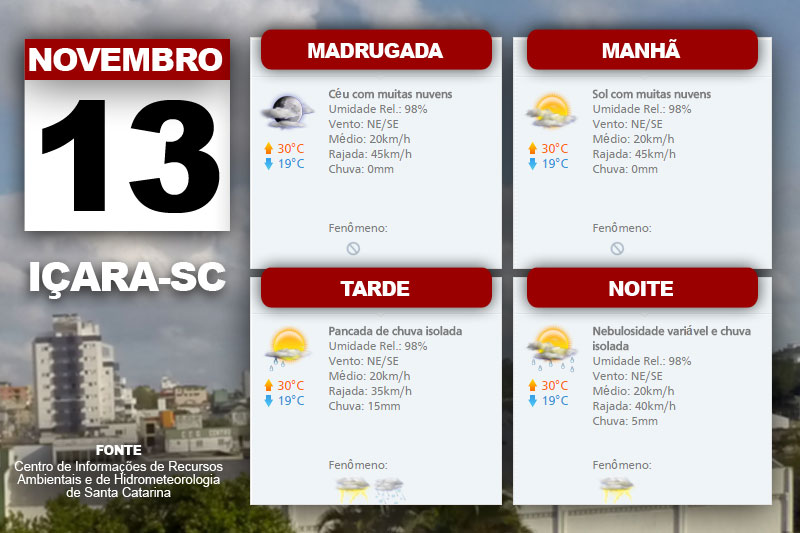 O Sol aparece principalmente no período da manhã. Entre a tarde e noite ocorrem então pancadas de chuva e descarga elétrica em todas as regiões. Do Oeste ao Litoral Sul a chuva fica mais intensa e o risco também é maior para temporais isolados. Ainda conforme o Centro de Informações de Recursos Ambientais e de Hidrometeorologia de Santa Catarina, o vento ocorre moderado de nordeste a sudeste.