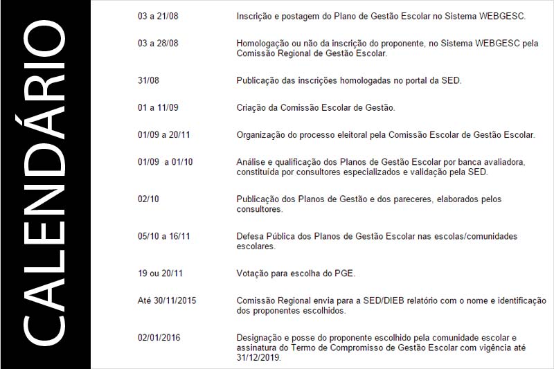 O professor, especialista em assuntos educacionais ou o assistente técnico-pedagógico que tiver interesse em ser diretor na rede estadual de ensino já deve começar o Plano de Gestão Escolar. O documento inscrito entre 3 e 21 de agosto será analisado por consultores especializados. “O principal objetivo desta análise é verificar se o plano está em conformidade com a realidade da escola. Devem ser definidas ações e metas que possam ser alcançadas para melhoria da educação e com a participação da comunidade escolar”, explica a coordenadora de Gestão Escolar da Secretaria de Estado da Educação, Maristela Fagherazzi.