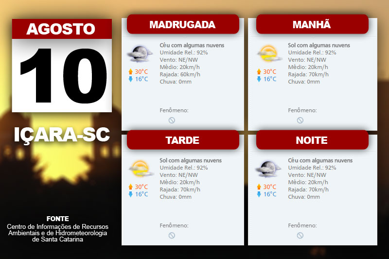 Uma extensa massa de ar seco predomina em grande parte do Brasil e inibe ainda a passagem de frentes frias no Sul do país. Isto significa que o tempo permanece seco e ensolarado no estado. “Nevoeiro ao amanhecer no Litoral e áreas próximas. A temperatura segue elevada para época do ano, mais alta no Oeste e Litoral. Vento de nordeste a norte, fraco a moderado, com rajadas”, aponta a meteorologista do Centro de Informações de Recursos Ambientais e de Hidrometeorologia de Santa Catarina, Laura Rodrigues.