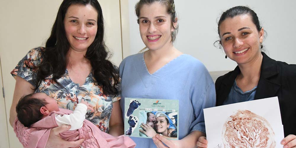 A placenta é um material biológico que pode ter a destinação definida pela mulher. Há quem congele, utilize para fins fitoterápicos ou transforme em uma linda recordação. No Hospital São Donato, o carimbo em papel pode ser realizado no local. "É uma lembrança que faz diferença e demonstra todo o carinho que a equipe tem", ressalta a puérpera Sidelma Ferreira Brígido. "São detalhes que tornam o parto mais humanizado. Recebi a imagem da placenta e uma foto do momento do nascimento de Heloísa. Irei para casa feliz com cada detalhe oferecido", completa a mamãe de segunda viagem.