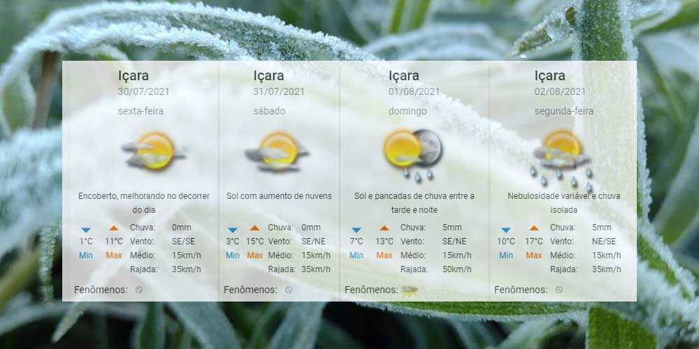 Temperatura: em elevação gradativa no decorrer do dia, e baixa com formação de geada no Planalto Sul, Planalto Norte e meio Oeste.