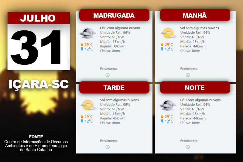 A massa de ar seco que predomina em Santa Catarina deixa o tempo firme com Sol nesta sexta-feira, dia 31. O ar seco permanece sobre o Sul do Brasil com poucas nuvens ainda no sábado, domingo e segunda-feira. “Temperatura elevada para a época do ano no período da tarde. Vento de nordeste a noroeste, fraco a moderado”, sublinha o meteorologista do Centro de Informações de Recursos Ambientais e de Hidrometeorologia de Santa Catarina, Marcelo Martins.