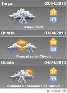 Nesta segunda-feira ainda há chance de pancadas isoladas de chuva com trovoadas no Oeste e Meio Oeste devido a influência um sistema de baixa pressão. Durante a terça e quarta-feira, a previsão fica então para instabilidade com chuva mais significativa também no Oeste de Santa Catarina. Ainda conforme a Epagri/Ciram, na quinta o tempo volta a ficar mais firme e seco. Temperatura mais elevada durante o dia e amena à noite, portanto, condição típica de outono. As temperaturas variam dos 12ºC aos 27ºC.