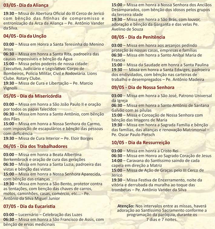 Novas muralhas cairão a partir deste domingo, dia 3. Após a entronização da Arca da Aliança na Paróquia São Donato serão ao todo sete dias e sete noites de celebrações às 3h, 6h30, 15h e 19h30. Todas com uma temática diferente. Cada intervalo terá também adoração ao Santíssimo Sacramento. Além disso, a igreja preparou espaços para a venda de itens religiosos e lanches.