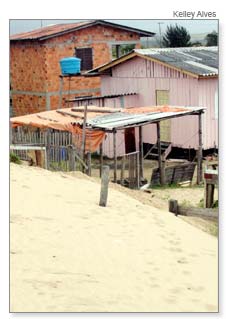 Os moradores da comunidade Chico do Poço, na Zona Sul do Rincão, além de conviverem diariamente em situação precária, incluindo falta de assistência social, vivem literalmente no meio das dunas. Em épocas de ventos fortes e tempestades, a areia é jogada para dentro dessas casas, contaminado os moradores com doenças de cachorros e animais soltos. “Todas as semanas eu tenho problema de bicho-de-pé, que pego dentro da minha própria casa”, desabafa a dona de casa Jucélia Zanela. A moradora diz que a intensidade da areia faz com que o carro de cor vermelha fique com chegue a ficar com tons de branco.