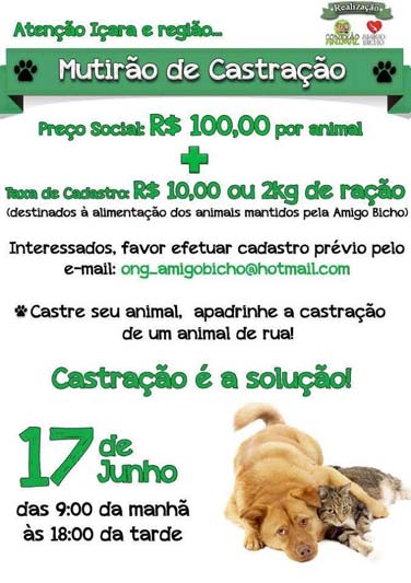 Segundo ela a castração é a melhor solução para reduzir os animais de rua e é importante as pessoas fazerem o procedimento. “O valor da castração é de R$ 100 por animal (independente se for cão ou gato) e mais R$ 10 ou 2kg de ração destinados à alimentação dos animais resgatados pela ONG”, explica a voluntária. O cadastro deve ser feito pelo e-mail ong_amigobicho@hotmail.com.