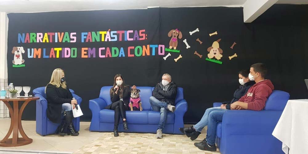 “O gênero em foco é o Conto, no entanto serão desenvolvidas atividades nos gêneros: notícia, entrevista e biografia entre outros, contemplando, assim, de forma não linear”, explica Eliane. A atividade proporcionada pela webconferência teve a participação dos médicos veterinários Gabriel Martignago Zilli e Gabriela Rodrigues Gaspar, do Centro de Castração Municipal Francisco de Assis; Carlos Alberto Fiorenza, fundador da ONG Amigo Bicho; e Kariny Piovezan, vice-presidente, junto com a cachorrinha de três patas Sophia, mascote de ONG.