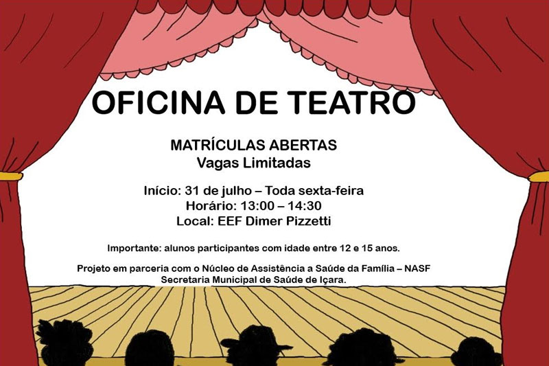 Oficinas de teatro serão realizadas pelo Núcleo de Apoio a Saúde da Família nas escolas estaduais a partir desta próxima sexta-feira, dia 31. A primeira dinâmica acontecerá das 13h às 14h30 na Escola Dimer Pizzeti. No mesmo dia da semana e horário ainda serão realizados o restante dos encontros. Todos os participantes terão acompanhamento do controle das vacinas, consulta médica e consulta odontológica oferecida pelo município.