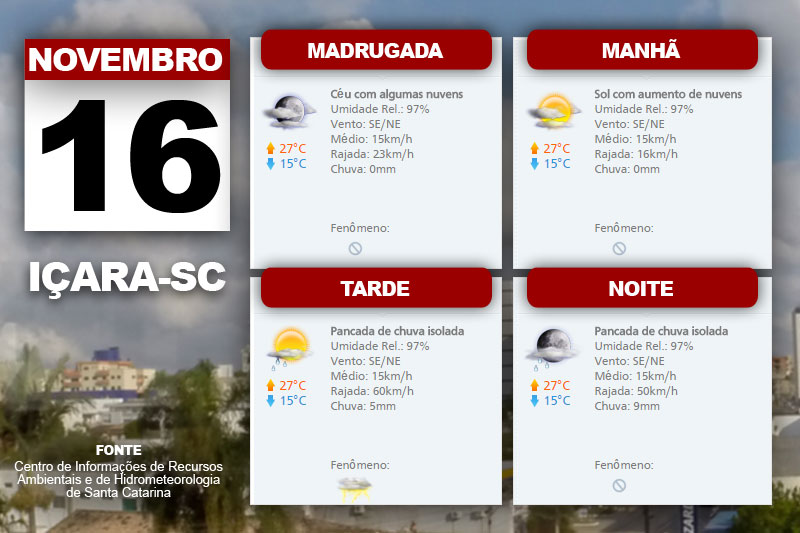 As pancadas de chuva e descarga elétrica iniciam pelo Oeste e Meio Oeste catarinense e se estendem entre a tarde e noite de forma isolada no Planalto Sul, Vale do Itajaí e Planalto Norte. Nas outras regiões, ocorre somente aumento de nuvens. O Centro de Informações de Recursos Ambientais e de Hidrometeorologia de Santa Catarina indica também temperatura elevada, especialmente, no Oeste.