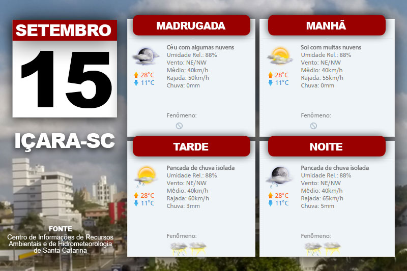 “Risco de temporal localizado com ventania e granizo nestas regiões, especialmente no Oeste. Temperatura mais elevada. Vento de nordeste a noroeste, moderado, com intensas rajadas”, acrescenta a meteorologista Centro de Informações de Recursos Ambientais e de Hidrometeorologia de Santa Catarina, Laura Rodrigues.