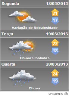 Durante a terça-feira permanece a nebulosidade variável com chuva isolada especialmente no Litoral e áreas próximas devido a circulação marítima, e em forma de pancadas isoladas entre a tarde e noite no Oeste e Meio Oeste. Temperatura amena. Vento de sudeste a leste, fraco a moderado com rajadas no Litoral.
