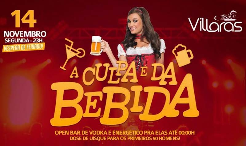 No Villaras as estrelas não vão receber a culpa por nada. A culpa será mesmo da bebida nesta segunda-feira, dia 14. A festa no casarão do bairro Liri acontecerá com Marlon Marques, Bailinho do Dedé, Lokamania, Luan & Marcos, além do DJ Bortollin. As mulheres terão ainda vodka e energético até meia-noite e os 50 primeiros homens receberão uma dose de uísque.