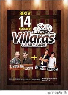 A balada no casarão do bairro Mareli terá Evandro Dias & Leandro, além de Elton & Everton nesta sexta-feira, dia 14. Os ingressos para o Villaras estão disponíveis no Posto Chile de Içara e da Próspera, em Criciúma. Aos homens custam R$ 20. E para as mulheres, estão por R$ 10. A casa também anuncia a lista bônus. Para fazer parte dela e ter acesso a desconto na bilheteria é preciso enviar o nome e o RG até as 18h para villaras@villaras.net.