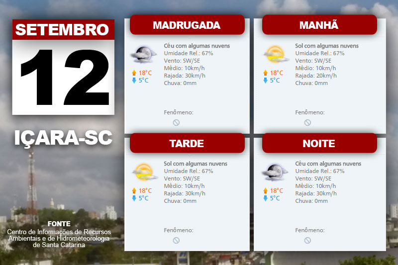 A temperatura sobre um pouco durante o dia neste sábado. Mas voltará a cair à noite. No domingo, o Sol volta a aparecer com presença de nuvens. No Litoral Norte, o tempo fica mais fechado e com chuva fraca. Conforme o Centro de Informações de Recursos Ambientais e de Hidrometeorologia de Santa Catarina, há previsão de chuva fraca à noite nas demais áreas do Litoral. Além disso, uma massa de ar frio favorece a temperatura baixa com formação de geada no Planalto Sul e áreas mais altas do Meio-Oeste.
