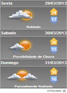 No domingo o Sol aparece na maioria das regiões, mas as nuvens aumentam e há chance de pancadas bem isoladas de chuva entre a tarde e noite devido a aproximação de uma nova frente fria. Temperatura em elevação. Conforme a Epagri/Ciram, abril inicia com condição de tempo seco em boa parte do Estado de chuva isolada no Litoral. As temperaturas variam dos 8ºC aos 26ºC.