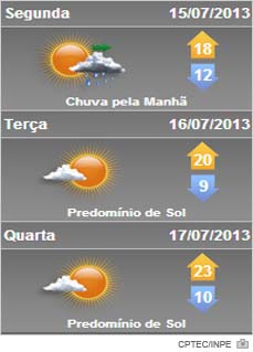 Nesta segunda-feira, mais nuvens ocorrem no início do dia com presença de Sol ao longo do período devido à atuação de uma massa de ar frio e seco do Planalto ao Litoral. Durante o dia as temperaturas não sobem muito e permanecem amenas. Vento de sudoeste a sul, fraco a moderado. Nos próximos dias os índices variam de 5ºC a 25ºC.