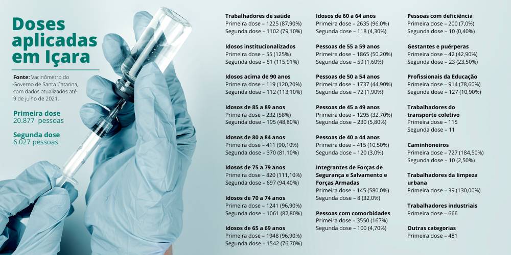 Na nova remessa, 532 doses devem destinadas para dar continuidade à vacinação dos grupos prioritários que ainda não receberam o imunizante e à população em geral por faixa etária. As outras 228 devem ser direcionadas aos trabalhadores industriais. Esse público foi incluído nesta semana na campanha e recebeu 666 doses até o momento em Içara, segundo o Vacinômetro do Governo de Santa Catarina. Os dados atualizados até esta sexta-feira mostram que o município já aplicou 26.904 doses no total, sendo 20.877 primeiras doses e 6.027 segundas doses.