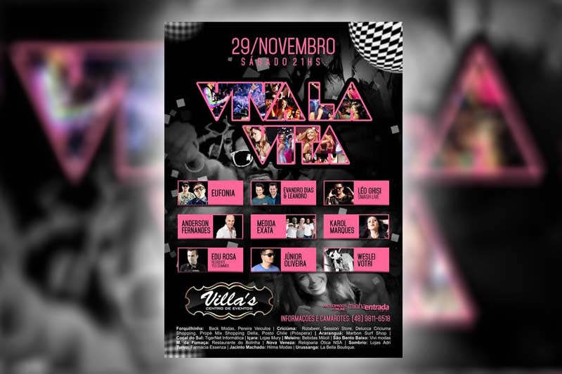 Não faltarão atrações na Viva La Vita. A balada no Villas terá Eufonia, Evandro Dias & Leandro, DJ Léo Ghisi, Anderson Fernandes, Medida Exata, Karol Marques, Edu Rosa, Júnior Oliveira e Weslei Votri a partir das 21 deste sábado, dia 29. Os ingressos antecipados para a festa em Segunda Linha podem ser adquiridos na Loja Mury por R$ 20. Na Internet a venda ocorre também pelo site Minha Entrada [www.minhaentrada.com.br]. A classificação indicativa é de 16 anos.