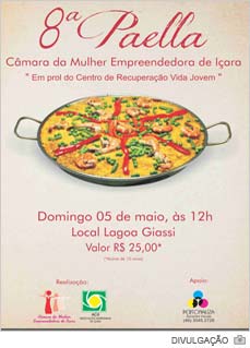 O núcleo feminino da Associação Empresarial de Içara vai promover a 8ª Paella Beneficente no próximo dia 5. O evento será mantido na Associação do Giassi, em Lagoa dos Esteves, no Rincão. Mas desta vez a renda será revertida para o Centro de Recuperação Vida Jovem. Os ingressos já estão disponíveis por R$ 25. Eles podem ser encontrados na própria comunidade terapêutica ou com as integrantes da Câmara da Mulher Empreendedora. O almoço com o Chef Motta acontecerá em parceria também com a Prefeitura Municipal de Içara.