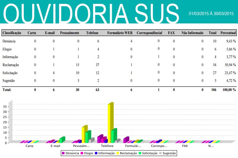 A Ouvidoria do Sistema Único de Saúde de Içara bateu um novo recorde em março. Foram 106 atendimentos. Dentre eles, 54 reclamações, 27 solicitações, 10 denúncias, seis elogios, cinco sugestões e quatro pedidos de informações. Isto significa o acréscimo de 107,8% em relação a fevereiro.